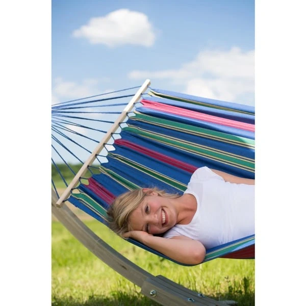 Die Aruba Hängematte besteht aus wetterfestem und UV-beständigem EllTex-Material (55% Baumwolle (recycelt), 45 % Polyester), wodurch sie extra haltbar und gleichzeitig kuschelig weich wie Baumwolle ist. Art.-Nr.: 1398722