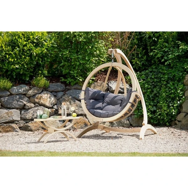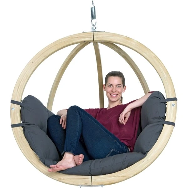 Der Globo Chair ist ein edler, aus wetterfest behandelter Fichte hergesteller Hängesessel. Die hochwertige Schichtverleimung sorgt für höchste Stabilität und Sicherheit. Die extra dicke, wasserabweisende und extra schnell trocknende Polsterung bietet perfekte Entspannung. Der extrem widerstandsfähige Stoffbezug ist weich wie Baumwolle, hat eine hohe Licht- und Witterungsbeständigkeit (Lichtechtheit 7/8), ist wasserabweisend, schimmel-resistent, schmutzunempfindlich und pflegeleicht. Der Globo Chair wird mit einer Spiralfeder geliefert und ist optional mit Gestell „Globo Stand“ (nicht im Lieferumfang enthalten) kombinierbar. Alle verwendeten Rohstoffe stammen aus Europa und wurden dort umweltfreundlich weiterverarbeitet.Art.-Nr.: 1593377