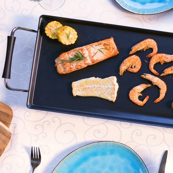Die Bestron ABP604 Plancha Grillplatte XXL ist eine hochwertige Backplatte mit Antihaftbeschichtung (Größe 90,5 x 23,7cm) und eignet sich ideal für z.B. Fleisch, Fisch, Gemüse und Kartoffeln. Der abnehmbare einstellbare Temperaturschalter besitzt eine Kontrollleuchte. Zum Betrieb ist kein Öl oder Fett notwendig, die Auffang-Rinne und -schale nimmt überschüssiges Fett oder Grillrückstände auf. Die ABP604 Plancha Grillplatte XXL ist leicht zu reinigen und kann im Innenbereich und geschützt im Freien verwendet werden.Art.-Nr.: 1432124
