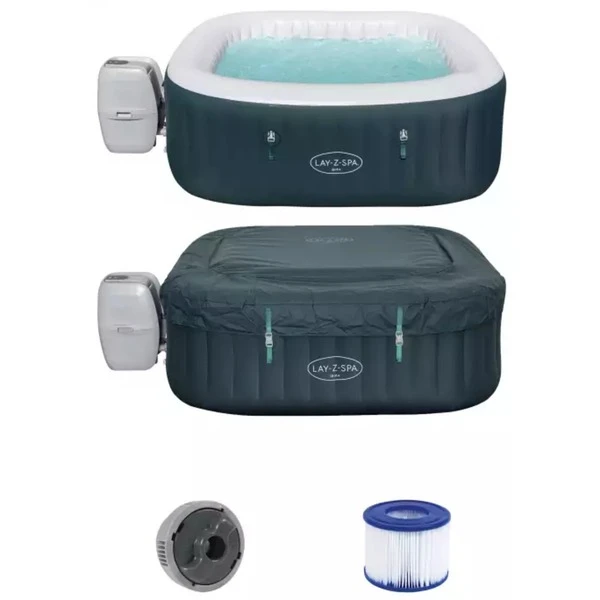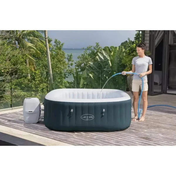 Der quadratische Whirlpool LAY-Z-SPA Ibiza AirJet von Bestway bietet sprudelndes Badevergügen für Innen und Außen. 140 AirJet Düsen bieten eine rundum entspannende Sprudelmassage. Der weiche, wärmeisolierende Boden des Whirlpools dient gleichzeitig als bequeme Sitzfläche. Das hochklappbare Bedienfeld und die digital gesteuerte Pumpe regeln die folgenden Funktionen: Heizung bis max. 40°C, das Heizsystem ist bis zu 40 Tage im Voraus programmierbar, AirJet-Massage, Reinigung (Filterleistung ca. 1.325 l/h), Luftbefüllung oder Luftabsaugung. Morgens eingestellt ist der Whirlpool nach Feierabend angenehm temperiert. Der Frostwächter macht den Whirlpool das ganze Jahr über nutzbar. Die automatische Heizung startet ab 6°C, schaltet sich bei 10°C wieder ab und verhindert so das Einfrieren des Wassers. Der Pool ist außerdem mit Tragegriffen und einem integrierten Ablassrohr ausgestattet. Der Aufbau ist einfach und ohne Werkzeug möglich. Man braucht den leeren Pool nur ausbreiten und mit der mitgelieferten AirJet-Pumpe aufblasen, Wasser einfüllen, Temperatur vorwählen und fertig! 6 Personen können hier ein belebendes, entspannendes Gefühl im eigenen Whirlpool genießen. Das Außenmaterial ist in Petrolblau mit Lederoptik gehalten, der Boden in Kieselmosaik-Optik.Art.-Nr.: 1719466
