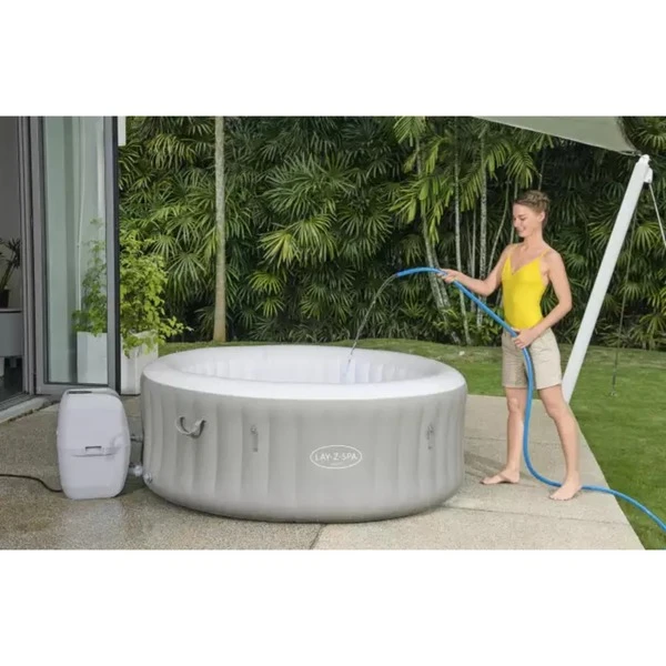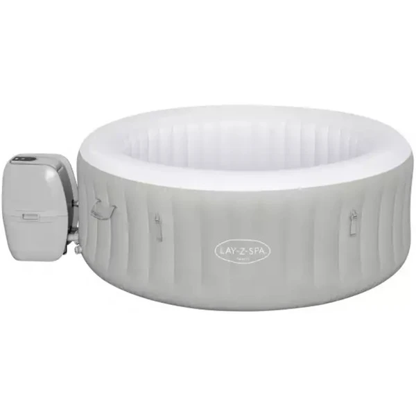 Der Whirlpool LAY-Z-SPA Tahiti AirJet von Bestway bietet sprudelndes Badevergügen für Innen und Außen. 120 AirJet Düsen und LED-Beleuchtung bieten eine rundum entspannende Sprudelmassage. Der weiche, wärmeisolierende Boden des Whirlpools dient gleichzeitig als bequeme Sitzfläche. Der LAY-Z-SPA Havana AirJet kann per App ferngesteuert werden, so kann das Heiz- und Massagesystem jederzeit und von überall bedient werden. Das hochklappbare Bedienfeld und die digital gesteuerte Pumpe regeln die folgenden Funktionen: Heizung bis max. 40°C, das Heizsystem ist bis zu 40 Tage im Voraus programmierbar, AirJet-Massage, Reinigung (Filterleistung ca. 1.325 l/h), Luftbefüllung oder Luftabsaugung. Morgens eingestellt ist der Whirlpool nach Feierabend angenehm temperiert. Der Frostwächter macht den Whirlpool das ganze Jahr über nutzbar. Die automatische Heizung startet ab 6°C, schaltet sich bei 10°C wieder ab und verhindert so das Einfrieren des Wassers. Der Pool ist außerdem mit Tragegriffen und einem integrierten Ablassrohr ausgestattet. Der Aufbau ist einfach und ohne Werkzeug möglich. Man braucht den leeren Pool nur ausbreiten und mit der mitgelieferten AirJet-Pumpe aufblasen, Wasser einfüllen, Temperatur vorwählen und fertig! Vier Personen können hier ein belebendes, entspannendes Gefühl im eigenen Whirlpool genießen. Das Außenmaterial ist in Wachsgrau gehalten, der Boden in Kieselmosaik-Optik.Art.-Nr.: 1719465