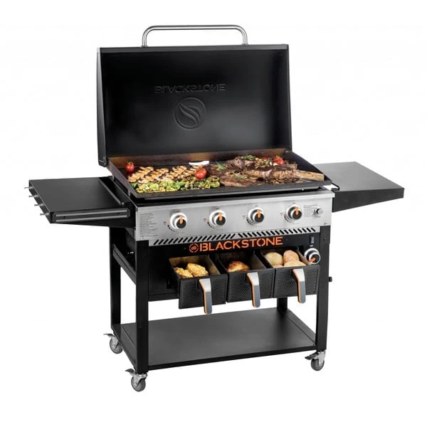 Der Blackstone Planchagrill, Griddle genannt, ist der neue Trend auf dem Grillmarkt! Und die 36″ Blackstone Griddle Grillstation mit eingebauten Airfryer-Fritteusen und Warmhalteschublade definiert Grill-Luxus neu. Der Griddle sorgt für ein perfektes Grillvergnügen ohne Anbrennen dank schneller und großer Hitze, gleichmäßiger Wärmeverteilung, besten Antihafteigenschaften und schneller Reinigung. Die vier getrennt regelbaren Temperaturzonen auf der Plancha ermöglichen die Zubereitung mit Spaß, gesunde und abwechslungsreiche Küche von knusprigem Speck zum Frühstück bis zu saftigen Burgern zum Abendessen. Mit den regulierbaren elektrischen Airfryern kann der Blackstone Griddle nicht nur grillen, sondern auch backen und frittieren. So gelingen Pommes, Chicken Wings oder Brötchen direkt im Grill. Die Blackstone Griddle Grillstation in der Größe 36″ bietet viel Platz und ist mit ihren vier heißen Grillzonen eine absolute Gourmet-Outdoorküche. Standardmäßig ist sie mit Piezozündung, einem patentierten Fettauffangsystem und zwei runterklappbaren seitlichen Ablagen als Arbeitsfläche ausgestattet, und lässt keine Wünsche offen. Der hochwertige Deckel verschafft die nötige Oberhitze und schützt die Grillplatte vor Wind und Wetter. Die 36″ Version mit Airfryer kommt zusätzlich mit acht Besteckhaltern, klappbaren Ablagen mit Magnetleiste für Grillbesteck und vier Lenkrollen mit Bremse. Die Blackstone Griddle Grillstation passt für europäische Gasflaschen. Der Gasschlauch mit Gasdruckregler wird separat benötigt. Die beiden Airfryer und die Warmhalteschublade werden komplett mit Strom betrieben und funktionieren unabhängig von der Griddle. Für den Betrieb des Airfryers wird daher zusätzlich eine normale Haushalts-Steckdose benötigt.Art.-Nr.: 100101968