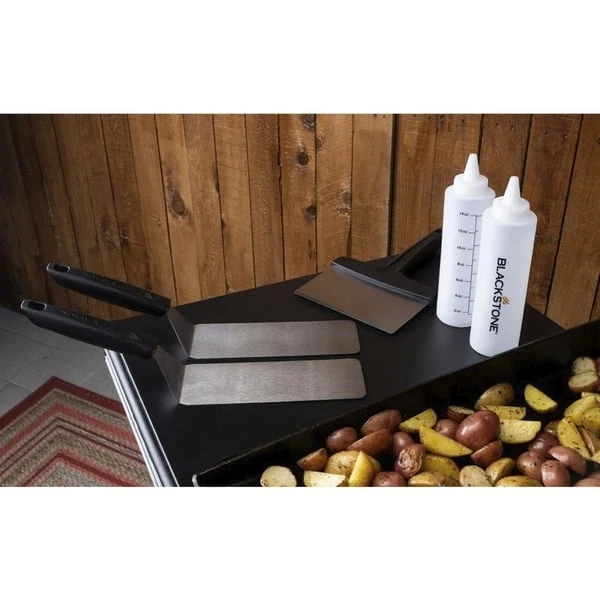 Das 5-teilige Griddle Professional Toolkit von Blackstone ist perfekt für den Anfänger oder den Grill-Meister geeignet. Das Profi-Grill-Zubehör enthält zwei Pfannenwender, einen Schaber und zwei Quetschflaschen. Die Pfannenwender aus Edelstahl dienen zum Wenden von Burgern und Pfannkuchen oder zum Zubereiten eines leckeren Pfannengerichts auf der Grillplatte. Die beiden 0,5 Liter Quetschflaschen sind ideal zum Aufbewahren von Wasser und Ölen, um sie zum Dämpfen und Kochen von Speisen zu verwenden, oder zum Dosieren von flüssigen Pancake-Teigen und ähnlichem. Der Edelstahlschaber verfügt über eine abgeschrägte Kante und einen hitzebeständigen Griff, was ihn zum perfekten Werkzeug macht, um die Grillplatte zu reinigen, nachdem alle Speisen auf den Tisch gebracht wurden. Ein ausgezeichnetes Geschenk für sich selbst oder jeden Grill-Fan.Art.-Nr.: 100101979