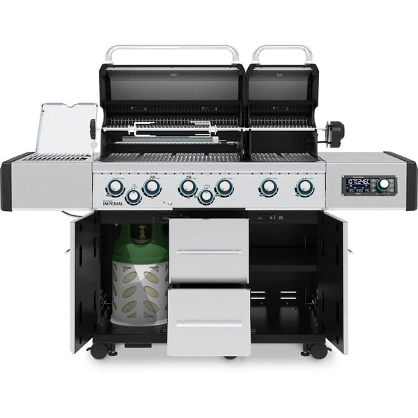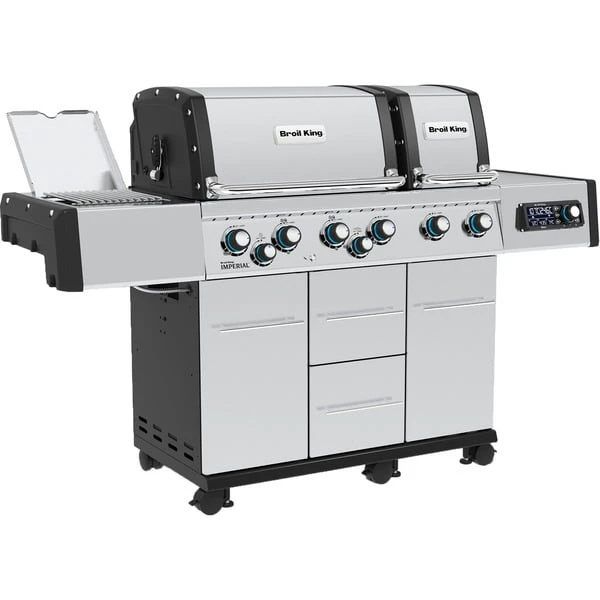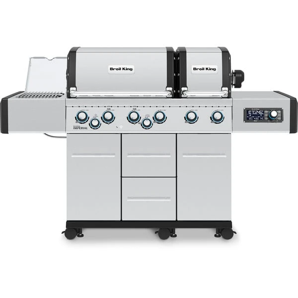 Der Gasgrill Imperial QS 690 IR von Broil King mit zwei Grillkammern, integrierter Grillflächenbeleuchtung und hochwertigem Edelstahl-Grillgehäuse ermöglicht mit der kabellosen iQue Smart Steuerung und digitalen Temperaturkontrolle per App Grillen auf Profi-Niveau. Der Grill besitzt sechs Rohrbrenner, einen 3,1 kW Infrarot-Seitenbrenner zum scharfen Anbraten und einen 4,4 kW Spießbraten-Heckbrenner. Die extrem leistungsstarken Rohr-in-Rohr Dual Tube Edelstahl-Hauptbrenner haben seitliche Brenneröffnungen und liefern doppelte Flammreihen, was die Hitze besonders gleichmäßig verteilt. Dank der elektronischen Zündung lässt sich der Grill schnell und einfach starten. Der Broil King Imperial QS 690 IR verfügt über neuartige, massive Edelstahl-Gussgrillroste, welche die Vorteile von Edelstahl und Guss vereinen. Sie bieten eine exzellente Hitzespeicherung zum scharfen Anbraten, sind dennoch pflegeleicht wie Edelstahlroste. Das Flav-R-Wave Verdampfungssystem aus Edelstahl sorgt für eine gleichmäßige Hitzeverteilung und vaporisiert Marinaden und Fleischsäfte, für ein Maximum an Grillgeschmack. Im geräumigen Wagen mit zwei Türen und zwei voll ausziehbaren Schubladen findet die 11kg Propangasflasche ihren Platz. Der in Edelstahl gehaltene Imperial QS 690 IR ist mit sechs seitlichen Besteckhaken ausgestattet. Er lässt sich mit den sechs leichtgängigen Lenkrollen sicher zum Einsatzort manövrieren und mit den drei höhenverstellbaren Rollen exakt waagerecht ausrichten.Art.-Nr.: 100134100