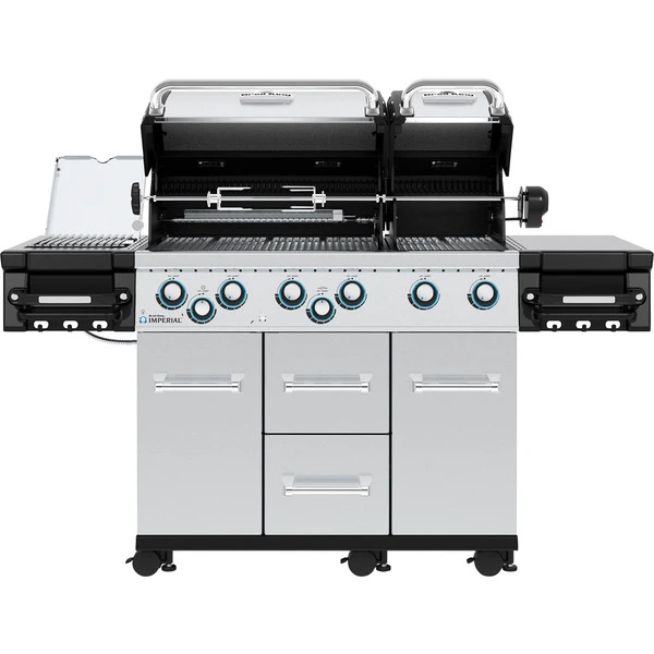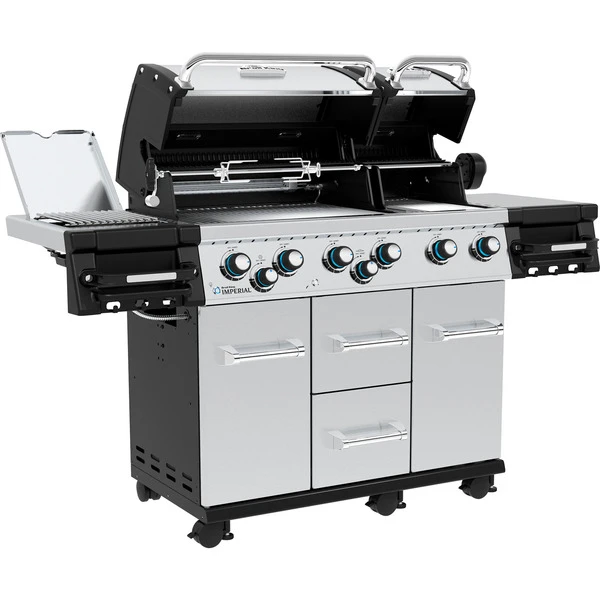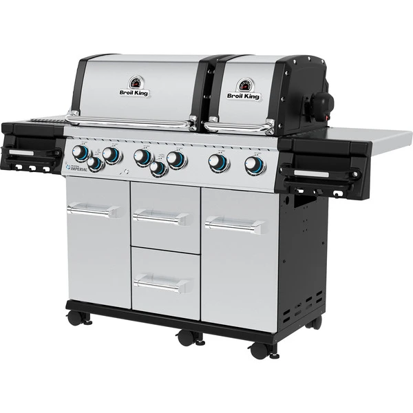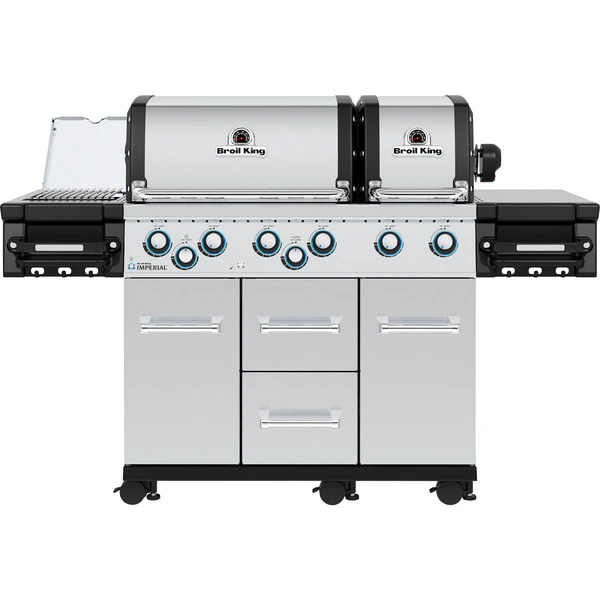 Der Gasgrill Imperial S 690 IR von Broil King mit zwei Grillkammern, integrierter Grillflächenbeleuchtung und hochwertigem Edelstahl-Grillgehäuse speichert die Wärme perfekt. Der Grill besitzt sechs Rohrbrenner, einen 3,1 kW Infrarot-Seitenbrenner zum scharfen Anbraten und einen 4,4 kW Spießbraten-Heckbrenner. Die extrem leistungsstarken Rohr-in-Rohr Dual Tube Edelstahl-Hauptbrenner haben seitliche Brenneröffnungen und liefern doppelte Flammreihen, was die Hitze besonders gleichmäßig verteilt. Dank der elektronischen Zündung lässt sich der Grill schnell und einfach starten. Der Broil King Imperial S 690 IR verfügt über neuartige, massive Edelstahl-Gussgrillroste, welche die Vorteile von Edelstahl und Guss vereinen. Sie bieten eine exzellente Hitzespeicherung zum scharfen Anbraten, sind dennoch pflegeleicht wie Edelstahlroste. Das Flav-R-Wave Verdampfungssystem aus Edelstahl sorgt für eine gleichmäßige Hitzeverteilung und vaporisiert Marinaden und Fleischsäfte, für ein Maximum an Grillgeschmack. Im geräumigen Wagen mit zwei Türen und zwei voll ausziehbaren Schubladen findet die 11kg Propangasflasche ihren Platz. Der in Edelstahl gehaltene Imperial S 690 IR ist außerdem mit zwei Deluxe Accu-temp Thermometern in den Deckeln, zwei Ablagefächern und sechs Besteckhaken an den Seitenablagen ausgestattet. Er lässt sich mit den sechs leichtgängigen Lenkrollen sicher zum Einsatzort manövrieren und mit den drei höhenverstellbaren Rollen exakt waagerecht ausrichten.Art.-Nr.: 100134113