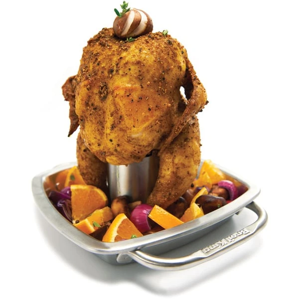Das Hähnchenbratgestell 69133 von Broil King besteht aus einer 1mm starken Tropfschale mit 10mm Griffen und einem Behälter für Flüssigkeiten. Der Behälter fasst den kompletten Inhalt der Bierdose und ersetzt die Dose. So bietet das Hähnchenbratgestell die Möglichkeit, auch andere Flüssigkeiten zum Garen des Hähnchens zu verwenden.Art.-Nr.: 100138815