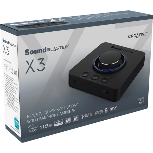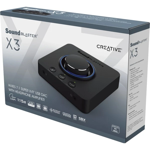 Der Creative Sound Blaster X3 ist ein hochauflösender 7,1-Mehrkanal-Super-X-Fi-USB-DAC-Verstärker, der eine 32-Bit- / 192-kHz-Wiedergabe ermöglicht. Mit dem Creative Sound Blaster X3 genießt man SuperX-Fi-Technologie, die Audioverstärkung der Sound Blaster Acoustic Engine und dem 600-OhmKopfhörerverstärker ein tolles holografisches Audioerlebnis für Filme und Spiele. Der Sound Blaster X3 verfügt über einen großen Lautstärkeregler zur bequemen Steuerung der Wiedergabe und der Mikrofon-Eingangslautstärke sowie Tasten zum einfachen Umschalten der Eingabe / Ausgabe von Quellen. Die Dolby Digital Live-Codierung ermöglicht eine Einzelkabelverbindung zum externen Dolby-Empfänger für die Mehrkanal-Audiowiedergabe.