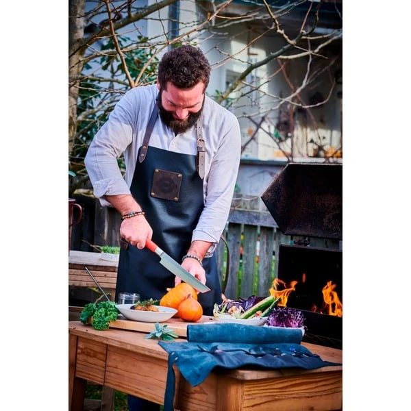 Die robuste Leder-Rolltasche Red Spirit 81768000-01 hat fünf Fächer, die mit fünf hochwertigen Kochwerkzeugen bestückt sind. Sie überzeugt mit geschmeidigem schwarzem Nappa-Leder im Vintage-Look. Durch die verstellbaren, soliden Lederriemen mit Schnallenverschluss können die Messer sicher und stilvoll transportiert werden. Das Set enthält ein Kochmesser „AJAX“ (20cm), ein japanisches Tantomesser (21cm), ein Zerlegemesser „HEKTOR“ mit Kullenschliff (26cm), eine Büffet-Pinzette (25cm) und ein Ausbeinmesser (15cm). Das Red Spirit Kochmesser AJAX ist ein ganz besonderes Messer, die außergewöhnliche Form erinnert an einen Spalter, ein unverzichtbares Werkzeug für die Fleisch-Verarbeitung. Die auffällige Klingenform mit breitem Klingenblatt und geschwungener Schneide eignet sich ideal zum Verarbeiten von Fleisch und Geflügel. Das Red Spirit Kochmesser AJAX ist das perfekte Messer für alle Grillbegeisterten und Fleischliebhaber, die Wert auf das Besondere legen. Wer Fleisch liebt, wird auch das Zerlegemesser „HEKTOR“ lieben. Es ist ideal zum Zerlegen von größeren Fleisch- und Fischstücken, es ist aber auch perfekt als Brisketmesser für den BBQ-Bereich geeignet. Der Kullenschliff reduziert dabei das Anhaften des Schneidguts. Die Red Spirit Messer von DICK sind kompromisslos auf Schärfe ausgelegt. Die Klingen werden extrem schlank ausgeschliffen, zusätzlich ist die Schneide noch poliert. Die runden, typisch asiatisch anmutenden Griffe der Messer besitzen eine außergewöhnliche Haptik. Die Red Spirit Messer sind einfach zu führen und erzeugen einen exakten, sauberen Schnitt. Das Schneidgut wird nicht gequetscht oder gebrochen, die wertvollen Aromastoffe in den Lebensmitteln bleiben erhalten.Art.-Nr.: 1892248