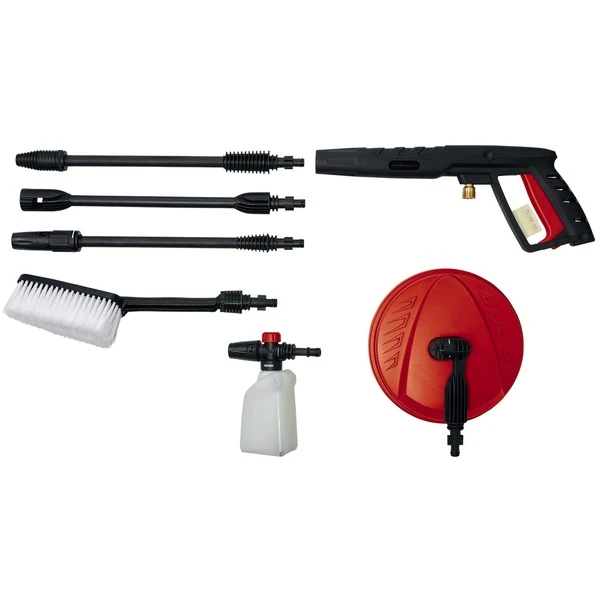 | Zubehör | vorhanden | Pistole, Hochdruckschlauch, Lanze, Punkt- und Breitsstrahldüse, rotierende Düse, Terrassenreiniger, Waschbürste, Sprühmittelbehälter | |
