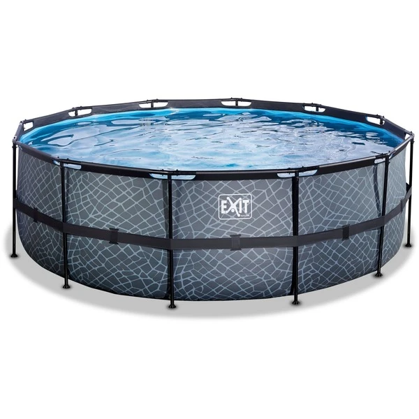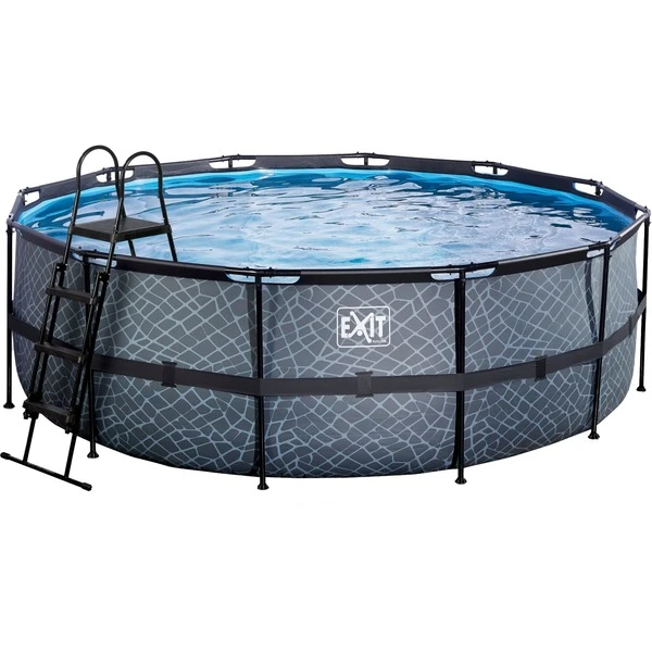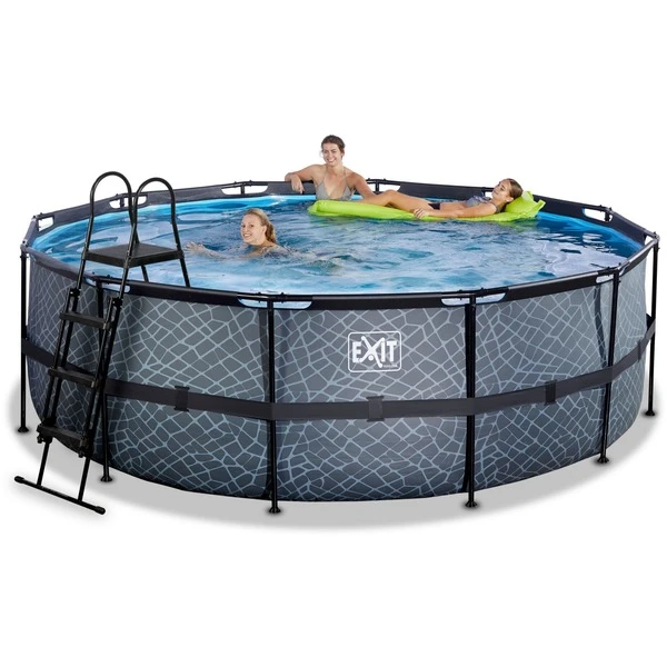 Der EXIT Stone Pool Ø 427 x 122cm ist ein runder, extra tiefer Stahlrahmenpool mit Steinoptik. Der große Pool ist standardmäßig mit einer Sandfilteranlage und einer Sicherheitsleiter ausgestattet und fällt durch sein rustikales Steinmuster zwischen anderen Pools auf. Der pulverbeschichtete stählerne Rahmen und die die starken Eckpunkte des EXIT Stone Pools sorgen dafür, dass der Pool immer stabil steht und jahrelang genutzt werden kann. Die mitgelieferte hochwertige Sandfilterpumpe reinigt auch kleinste Partikel aus dem Pool, indem sie das Wasser durch ein Filterbett pumpt. Dreck, wie Sand, Ungeziefer oder Algen landen im Filter. Das Steinmuster und der schwarze Rahmen geben dem Stone Pool eine einzigartige Ausstrahlung und dank des natürlichen Aussehens integriert sich der Pool völlig in den Garten. Die Innenseite des Pools ist erfrischend blau. Die runde Form des hochwertigen Rahmenpools schafft eine gemütliche Atmosphäre und sorgt dafür, das man mit bis zu sieben Personen Tauch- und Badespaß im Pool erleben kann. Die mitgelieferte 122cm hohe Leiter mit Anti-Rutsch Kunststoff-Stufen und Podest lässt sich sehr einfach aufbauen. Bei Nichtgebrauch lassen sich die drei äußeren Stufen komplett hochklappen, um unbefugtes Betreten des Pools zu verhindern.Art.-Nr.: 1783059