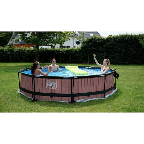 Der EXIT Wood Pool Ø 360 x 76cm ist ein runder Stahlrahmenpool mit Holzoptik. Der Pool ist standardmäßig mit einer Filterpumpe ausgestattet und fällt durch sein rustikales Holzmuster zwischen anderen Pools auf. Der pulverbeschichtete stählerne Rahmen und die die starken Eckpunkte des EXIT Wood Pools sorgen dafür, dass der Pool immer stabil steht und jahrelang genutzt werden kann. Die mitgelieferte Filterpumpe hält das Wasser sauber und in Bewegung, so dass einer Verschmutzung des Wassers entgegengewirkt wird. Das Holzmuster und der schwarze Rahmen geben dem Wood Pool eine einzigartige Ausstrahlung und dank des natürlichen Aussehens integriert sich der Pool völlig in den Garten. Die Innenseite des Pools ist erfrischend blau. Die runde Form des hochwertigen Rahmenpools schafft eine gemütliche Atmosphäre und sorgt dafür, das man mit bis zu fünf Personen Badespaß im Pool erleben kann.Art.-Nr.: 1783017