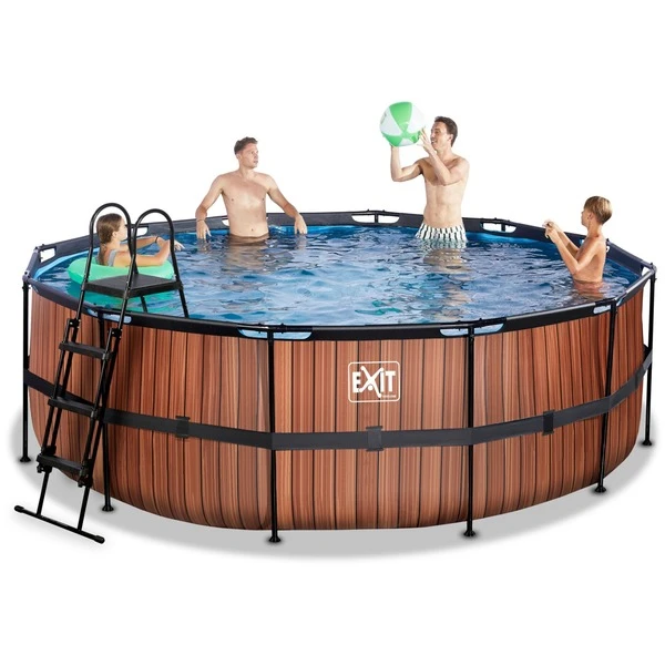 Der EXIT Wood Pool Ø 427 x 122cm ist ein runder, extra tiefer Stahlrahmenpool mit Holzoptik. Der große Pool ist standardmäßig mit einer Filterpumpe und einer Sicherheitsleiter ausgestattet und fällt durch sein rustikales Holzmuster zwischen anderen Pools auf. Der pulverbeschichtete stählerne Rahmen und die die starken Eckpunkte des EXIT Wood Pools sorgen dafür, dass der Pool immer stabil steht und jahrelang genutzt werden kann. Die mitgelieferte Filterpumpe hält das Wasser sauber und in Bewegung, so dass einer Verschmutzung des Wassers entgegengewirkt wird. Das Holzmuster und der schwarze Rahmen geben dem Wood Pool eine einzigartige Ausstrahlung und dank des natürlichen Aussehens integriert sich der Pool völlig in den Garten. Die Innenseite des Pools ist erfrischend blau. Die runde Form des hochwertigen Rahmenpools schafft eine gemütliche Atmosphäre und sorgt dafür, das man mit bis zu sieben Personen Tauch- und Badespaß im Pool erleben kann. Die mitgelieferte 122cm hohe Leiter mit Anti-Rutsch Kunststoff-Stufen und Podest lässt sich sehr einfach aufbauen. Bei Nichtgebrauch lassen sich die drei äußeren Stufen komplett hochklappen, um unbefugtes Betreten des Pools zu verhindern.Art.-Nr.: 1783054