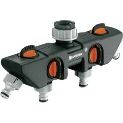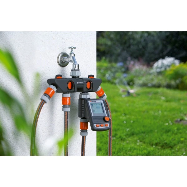 Mit dem GARDENA 4-Wege-Verteiler (8194-20) ist es möglich, vier Geräte an einen Wasserhahn anzuschließen. Alle vier Ausgänge sind stufenlos regulierbar und absperrbar. Es lassen sich zwei Bewässerungscomputer oder Bewässerungsuhren anschließen. Der GARDENA 4-Wege-Verteiler ist auf das GARDENA Profi-System mit dem Profi-Hahnstück umrüstbar und passt auf Wasserhähne mit 33,3mm (G 1“)-Gewinde und mit 26,5mm (G 3/4″)-Gewinde. Art.-Nr.: 1213914