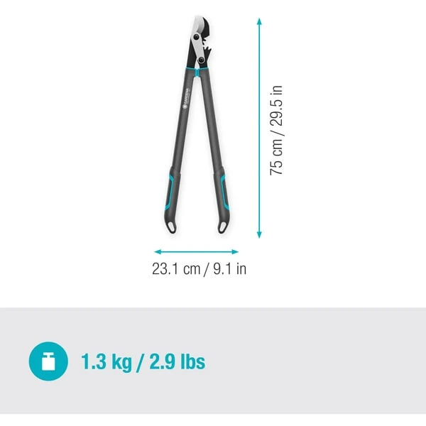 Die mechanische Astschere EnergyCut Pro L von GARDENA zeichnet sich durch hohe Schneidkraft, ergonomische Form und dank der Aluminiumrohre durch geringes Gewicht aus. Das integrierte Powergetriebe sorgt für eine enorme Kraftersparnis und 3x mehr Schneidkraft. Sie besitzt eine Gesamtlänge von 75cm und eignet sich zum Schneiden von Holz mit einem Durchmesser von bis zu 50mm. Die Bypass-Astschere verfügt über zwei scharfe, bis in die Spitzen präzisionsgeschliffene Klingen aus Qualitätsstahl, hergestellt aus exklusiver Legierung. Sie eignet sich damit ideal zum sauberen Rück- oder Pflegeschnitt frischer grüner Äste. Die antihaftbeschichteten Klingen liefern einen sauberen und glatten Schnitt. Die Beschichtung PowerCoating verbessert die Schneidleistung, schützt die Klingen vor Korrosion, und sorgt für eine leichte Reinigung. Zusätzlich ist die Astschere EnergyCut Pro L mit Anschlagspuffern ausgestattet, was die Handgelenke schont.Art.-Nr.: 100081887