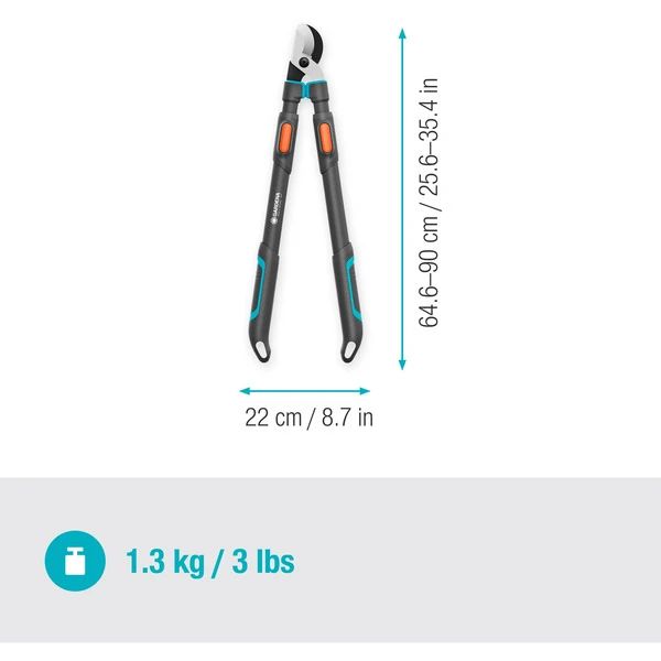 Die mechanische Astschere TeleCut Pro L von GARDENA zeichnet sich durch hohe Schneidkraft, ergonomische Form und dank der teleskopierbaren Aluminiumrohre durch geringes Gewicht aus. Sie besitzt eine Gesamtlänge von 65cm, die sich bis auf 90cm ausziehen lässt und eignet sich zum Schneiden von Holz mit einem Durchmesser bis 50mm. Die Bypass-Astschere verfügt über zwei scharfe, bis in die Spitzen präzisionsgeschliffene Klingen aus Qualitätsstahl, hergestellt aus exklusiver Legierung. Sie eignet sich damit ideal zum sauberen Rück- oder Pflegeschnitt frischer grüner Äste. Die antihaftbeschichteten Klingen liefern einen sauberen und glatten Schnitt. Die Beschichtung PowerCoating verbessert die Schneidleistung, schützt die Klingen vor Korrosion, und sorgt für eine leichte Reinigung. Durch das geringe Gewicht und die hervorragende Ergonomie fällt das Schneiden von Ästen mit der Astschere TeleCut Pro L leicht. Zusätzlich ist sie mit Anschlagspuffern ausgestattet, was die Handgelenke schont.Art.-Nr.: 100081884