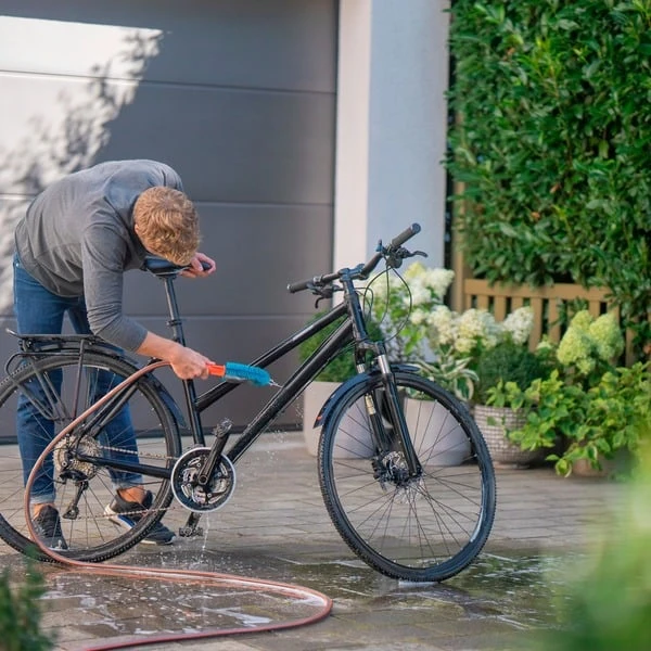 Die Cleansystem Fahrradbürste von GARDENA eignet sich zum gründlichen und schonenden Reinigen von Fahrrädern, E-Bikes, Fahrradanhängern oder Kinderwagen. Die Borsten dienen zum Reinigen des Rahmens, der austauschbare Schwamm säubert empfindliche Oberflächen wie die Speichen. Die Wasserzufuhr kann stufenlos reguliert oder auch komplett abgestellt werden. Das GARDENA Cleansystem ist die ideale Lösung für alle Reinigungsaufgaben rund um Haus und Garten. Das wasserführende Reinigungssystem mit dem Original GARDENA System-Anschluss ist vielseitig kombinierbar. Es besteht aus verschiedenen Handbürsten für den Einsatz auf kleineren Flächen und Stielen mit passenden Vorsatzgeräten, wenn mehr Reichweite benötigt wird oder die zu reinigende Fläche größer ist. Der Wasserdurchfluss ist stufenlos regulierbar, und die Nasspflege kann mit klarem Wasser oder unter Zusatz von GARDENA Reinigungstabs oder GARDENA Seifenstäbchen erledigt werden.Art.-Nr.: 100025438