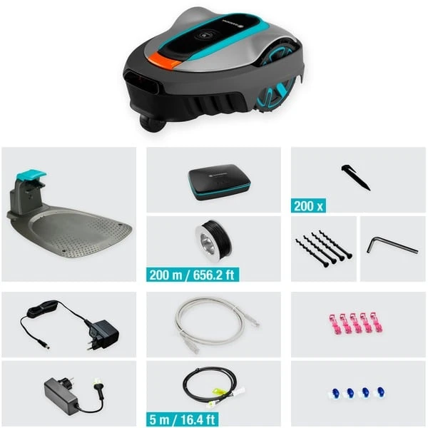 | Zubehör | vorhanden | smart Gateway, Begrenzungskabel 150m, Haken 200 Stück, 5m Niederspannungskabel | |