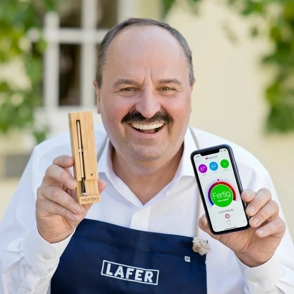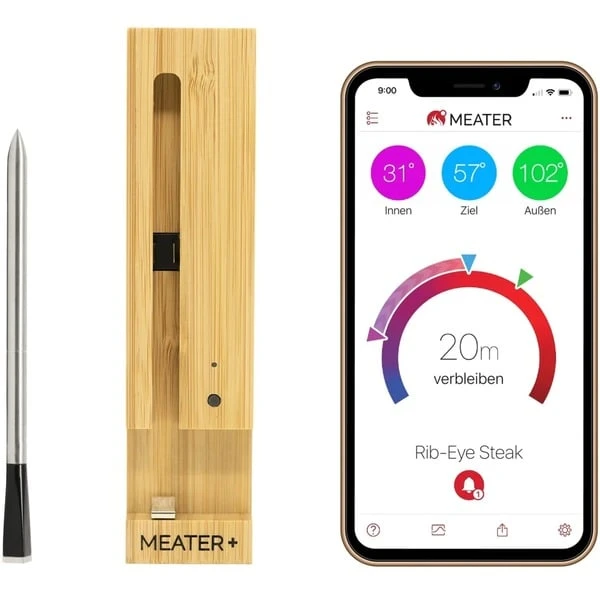Das Meater Plus ist das erste wirklich drahtlose, smarte Fleischthermometer. Mit dem Meater holt man sich mehr Freiheit an Grill, Smoker oder in die Küche. Das drahtlose Thermometer wird einfach in das Fleisch gesteckt. Unabhängig von der Garmethode kann der Meater in einer Pfanne, einem Ofen, einem Grill oder einer Rotisserie verwendet werden. Er verfügt über zwei Sensoren, einen für die Kerntemperatur, bis zu 100°C, und einen für die Umgebungstemperatur bis zu 275°C. Der Meater lässt sich per Bluetooth 4.0 mit dem Smartphone, Tablet oder PC verbinden. Die App berechnet anhand von vorgewählter Zubereitungsart, Fleischsorte und Gewicht die optimale Garzeit. Wenn das Fleisch die gewünschte Garstufe erreicht hat, wird der Nutzer über ein Signal benachrichtigt. Der komplette Garprozess kann auf diese Weise verfolgt werden. Die App gibt auch eine Einführung durch jeden Schritt des Garprozesses, um für perfekte und konsistente Ergebnisse zu sorgen. Es lassen sich außerdem zeit- und/oder temperaturbasierte Alarme/Benachrichtigungen manuell einstellen. Das Fleischthermometer Plus erweitert durch einen Repeater in der Ladestation den Funkbereich auf 50 Meter. Art.-Nr.: 100097304