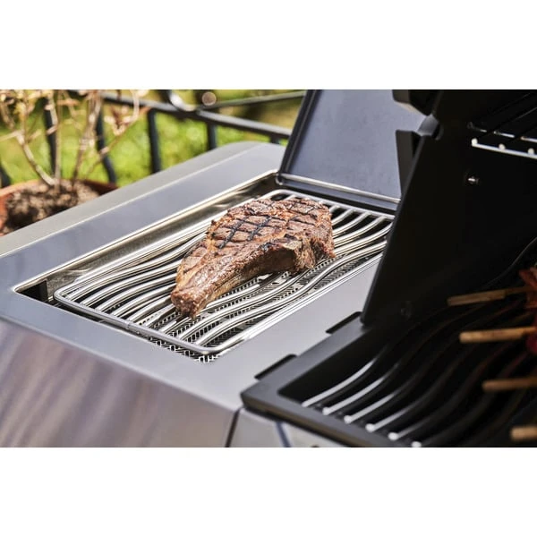 Der Napoleon Prestige 665 Connected Edelstahl vereint unter seiner schicken und platzsparenden LIFT EASE Rollhaube alles, was sich ein Grillmeister wünschen kann. Mit 5 Hauptbrennern, einem Infrarot-Heckbrenner für Gerichte vom Drehspieß und dem Infrarot SIZZLE ZONE Seitenbrenner für perfekte Steaks ermöglicht er vielfältigste Formen der Zubereitung und bietet WLAN- und Bluetooth-Konnektivität. Temperaturüberwachung, Timer, Grillunterstützung und Warnungen vor zu hohen Temperaturen, alles über das Smartphone. Mit der großzügigen Hauptgrillfläche plus Warmhalterost lassen sich Familie, Freunde, Nachbarn und der Fußballclub verköstigen. Der abnehmbare Warmhalterost lässt sich im Grill verstauen, während ein verbessertes internes Aufbewahrungssystem im Korpus für mehr Ordnung sorgt. Praktisch und clever konstruiert sind auch die Seitenablagen aus Edelstahl: Links verbirgt sich die Sizzle Zone als Seitenbrenner. Die großzügigen Seitenablagen bieten außerdem extra Zubereitungsfläche sowie praktische Besteckhaken. Die ergonomischen Drehregler besitzen eine angenehme Haptik und sorgen für eine präzise Temperatursteuerung. Die LED-Regler bieten nicht nur eine Leuchtfunktion, sondern leuchten außerdem dank der Funktion SafetyGlow in rot für einen zusätzlichen Hinweis, dass die Brenner eingeschaltet sind. Das Napoleon-typische Wellen-Design der WAVE Grillroste sorgt für eine gleichmäßigere Hitzeverteilung und hält auch kleineres Grillgut sicher auf dem Rost. Edelstahl-Flammenschutzeinsätze bilden eine extra Oberfläche und werden so zu Aromaschienen, die dem Grillgut eine besonders aromatische Grillnote verleihen. Der Infrarot-Heckbrenner eignet sich hervorragend zum Grillen großer Bratenstücke und ist natürlich ideal für Drehspieß-Gerichte geeignet (Drehspieß nicht im Lieferumfang enthalten).Art.-Nr.: 100097429