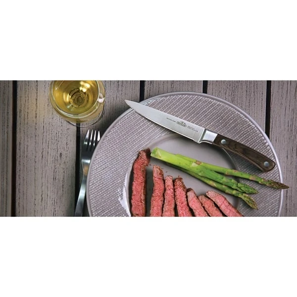 Ein Steakmesser hat zwei zentrale Aufgaben, es muss leichtgängig durch das perfekt gegarte Stück Fleisch gleiten und es soll dabei großartig aussehen. Napoleons Steakmesser 55208 mit einer über 12cm langen Klinge kann sogar mehr als das: Die Klinge erstreckt sich über die gesamte Länge und ist optimal ausbalanciert. So liegt das Napoleon Steakmesser gut und sicher in der Hand und gleitet mühelos durchs Grillgut. Zwei unterschiedliche Schnittbereiche unterstützen dabei den perfekten Schnitt: Der Säge-Bereich setzt gezielt an, während die glatte Klinge mühelos einen geraden Schnitt hinterlässt.Art.-Nr.: 1404518