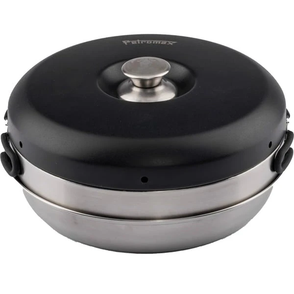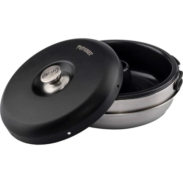 Der kompakte Petromax Dimego Camp Oven ist eine ideale Ergänzung für unvergessliche Campingmomente. Mit seiner Innenbeschichtung aus Keramik eignet er sich ideal für frische Ofen-Gerichte wie überbackene Aufläufe, knusprige Brötchen oder saftige Kuchen. Der Camping Backofen besteht aus drei Teilen: dem Basiselement, das direkt auf dem Kochkreuz des Gaskochers platziert wird, einer beschichteten Ringform mit Griffen und einem Deckel. Der Camping Backofen bietet eine dreifache Wärmeverteilung, die Ober-, Unter- und Seitenhitze umfasst. Die Wärme steigt von der Basis in die Auflaufform und wird durch die ausgeklügelte Wärmeverteilung und die doppelwandige Konstruktion gleichmäßig aus drei verschiedenen Richtungen auf die Speisen geleitet, von oben, unten und von den Seiten. Von mit Käse überbackenem Gemüse über frisch gebackene Brötchen bis hin zu herzhaftem Chili con Carne – eine Vielzahl von Backofengerichten gelingt perfekt, der Fantasie sind keine Grenzen gesetzt. Die hochwertige Beschichtung des Dimego Camp Ovens ermöglicht reibungsloses Backen und Kochen, ohne dass etwas anbrennt. Dadurch ist er auch besonders leicht zu reinigen, und das robuste Edelstahlmaterial macht ihn langlebig und widerstandsfähig. Durch seine kompakten Abmessungen passt der Camping Backofen perfekt in Euroboxen, die bei vielen Campern verwendet werden. Der Petromax Dimego Camping Backofen ermöglicht das Kochens verschiedenster Mahlzeiten auch unterwegs in der freien Natur.Art.-Nr.: 100100187