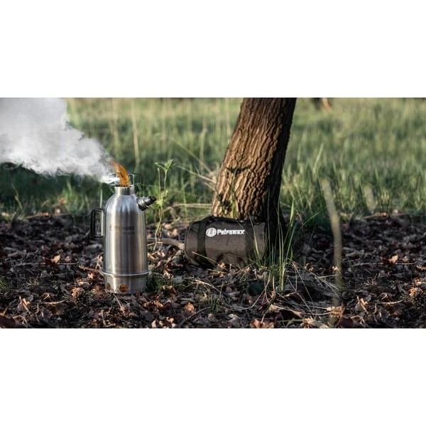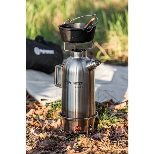 Die doppelwandige Petromax Feuerkanne fk-le75 aus Edelstahl bereichert die Outdoor-Küche um einen autarken Kocher. Während Zweige, Rinde oder kleine Tannenzapfen knisternd in der Feuerschale verbrennen, steigt die Hitze des Feuers durch das Innere der Kanne auf und bringt das Wasser in der Wand der Feuerkanne in wenigen Minuten zum Kochen. Sobald das Wasser brodelt und kocht, pfeift die Dampfpfeife. Der zusätzliche Schraubdeckel sorgt für einen auslaufsicheren Wassertransport. Dank der drei Füße hinterlässt die Feuerkanne keine Brandstelle und steht sicher auf jedem Untergrund. Die Feuerschale und die Füße können zum Transport und zur Lagerung passgenau in der Bodenöffnung der Feuerkanne verstaut werden. Dank der Silikongriffe ist das Entfernen von der Hitzequelle problemlos möglich. Mit der robusten Edelstahl-Feuerkanne fk-le75 kann man unabhängig ins Abenteuer starten und spart dabei Stauraum für Gaskartuschen oder andere Brennmittel.Art.-Nr.: 1806433