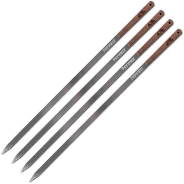 Die 52cm langen Petromax Grillspieße sind ein unverzichtbares Zubehör für alle Grillliebhaber und Outdoor-Köche. Ob beim gemütlichen Barbecue im Garten oder beim Campingausflug, die Grillspieße sind die perfekte Ergänzung. Gefertigt aus robustem, langlebigem Edelstahl, ermöglichen diese Spieße das mühelose Aufspießen von Fleisch und Gemüse. Selbst dicke Stücke wie Schaschlik, Gulasch oder große Gemüsestücke lassen sich problemlos handhaben. Das Set enthält vier hochwertige Spieße mit einer Klingenlänge von 40cm, was ausreichend Platz für eine Vielzahl von Zutaten bietet. Der fest vernietete Griff aus edlem Walnussholz liegt angenehm in der Hand und sorgt für einen komfortablen, sicheren Halt während des Grillens. Das Walnussholz mit Petromax-Logo verleiht den Spießen zudem eine stilvolle Optik und eine besondere Haptik. Mit den Grillspießen wird jedes Grillerlebnis zu einem echten Genuss, sei es für Fleischliebhaber oder für Vegetarier. Sie sind das perfekte Werkzeug, um kreativ zu werden und neue, leckere Grillkreationen auszuprobieren. Ihre Hitzebeständigkeit von über 200°C macht sie äußerst vielseitig und sie halten auch hohen Temperaturen problemlos stand. Sie lassen sich nicht nur auf dem herkömmlichen Grillrost nutzen, sondern auch direkt über offenem Feuer. Sie können beispielsweise auf dem Petromax Steck-Windschutz oder dem Atago Reflektorschild eingesetzt werden. Eine praktische Öse am Griffende ermöglicht es, die Spieße platzsparend aufzuhängen, wenn sie nicht in Gebrauch sind.Art.-Nr.: 100100185