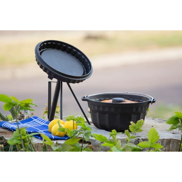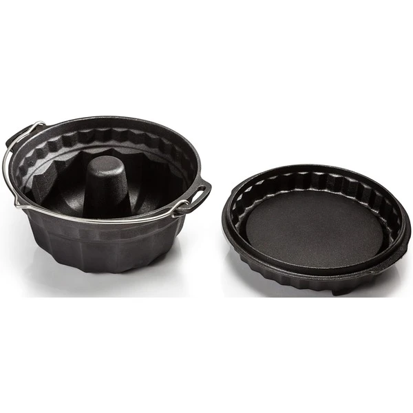 Mit der gusseisernen Gugelhupfform gf1 von Petromax backt man nicht nur leckeren Kuchen, auch frisches Brot und Aufläufe gelingen in der klassischen Kranzform ideal. Der Gussdeckel der Form vereint mehrere Anwendungsmöglichkeiten: Er ermöglicht das Backen mit Oberhitze in der Draußen-Küche und verfügt umgedreht über eine Tortenbodenfunktion. Die gusseiserne Gugelhupfform mit dem praktischen Tragehenkel aus Edelstahl zum Aufhängen ist hervorragend für das Backen und Kochen über offenem Feuer geeignet, kann aber auch problemlos für das Backen im Backofen verwendet werden. Das Gusseisen der Gugelhupfform stellt sicher, dass die Wärme effizient gespeichert und gleichmäßig an das Backgut weitergeleitet wird. Außerdem ist die Oberfläche bereits vorbehandelt (seasoned finished) und macht somit ein erstmaliges Einbrennen unnötig. Auf dem Deckel der Gugelhupfform lassen sich dank erhöhtem Rand Glut oder Holzkohle einfach platzieren. Auf diese Weise werden Kuchen, Brot oder Auflauf gleichmäßig gar. Doch die Form bietet noch mehr. Der Deckel mit Tortenbodenform kann umgedreht zum Backen von Tortenböden sowie für leckere Quiches und Tartes genutzt werden. Auf seine drei Füße gestellt, dient er zudem als Pfanne oder als praktische Servierplatte.Art.-Nr.: 1533728