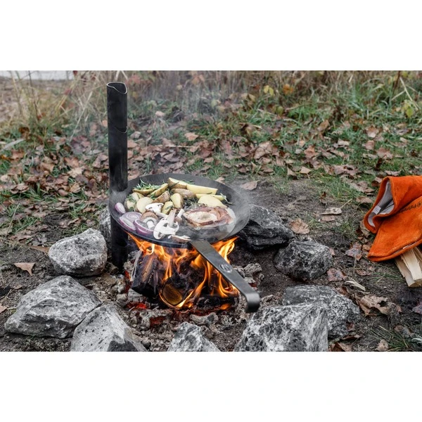 Mit der Petromax Lagerfeuerhalterung brkt-sp3 für schmiedeeiserne Pfannen kann man deftige Pfannengerichte in perfektem Abstand zum Feuer braten. Neben der Feuerstelle im Boden verankert, ist das Standbein aus Stahl im Handumdrehen einsatzbereit. Dann kann das Lagerfeuer-Abenteuer auch schon beginnen: Man platziert die schmiedeeiserne Pfanne in eine der drei Einkerbungen der Halterung und bereitet die Mahlzeit in der gewünschten Höhe direkt über der Feuerstelle zu. Deftige Steaks, saftige Reibekuchen oder eine feurige Nudelpfanne brutzeln so mit idealer Hitze. Die standfeste Halterung made in Germany ist für alle schmiedeeisernen Pfannen von Petromax geeignet und lässt sich flexibel neben verschiedenen Feuerstellen platzieren. So steht dem rustikalen Koch-Erlebnis über dem klassischen Lagerfeuer in freier Natur oder über einer Feuerschale nichts mehr im Weg.Art.-Nr.: 1885898