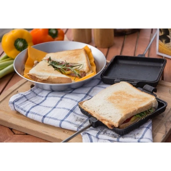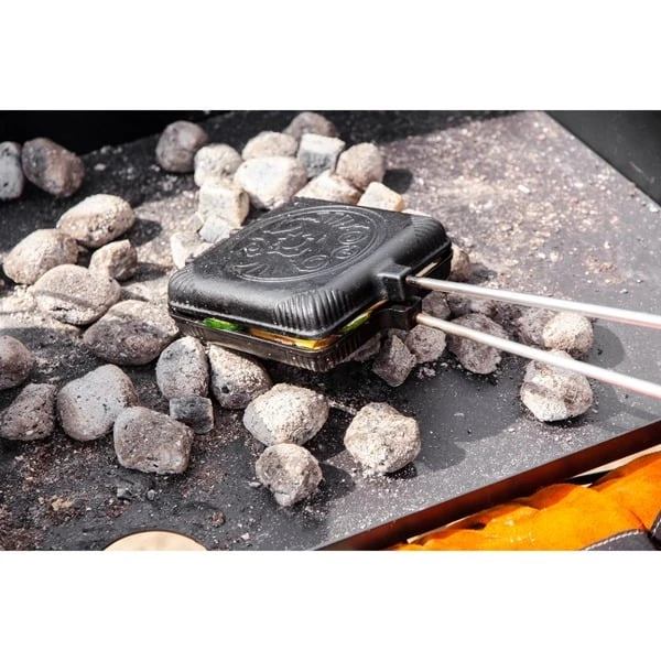 Das Sandwicheisen sw-iron von Petromax eignet sich perfekt für Toasts, Bagels oder Teigtaschen. Ob am Lagerfeuer oder auf dem Grill, das Toastbrot wird knusprig geröstet und die Füllung, herzhaft oder süß, wird lecker saftig. Die gusseisernen Formen sind ideal für Toastscheiben der Größe 11 x 11cm und dank der vorbehandelten Oberfläche (seasoned finish) sofort einsatzbereit. Weil das Material die Hitze perfekt speichert, können Sandwiches und Co. auch mit der Restwärme gebacken werden. Der praktische Verschlusshaken hält die Toastpfannen zusammen, damit nichts herausfällt. Zum Reinigen lassen sich die Gusshälften über das Scharnier einfach voneinander trennen.Art.-Nr.: 1533730