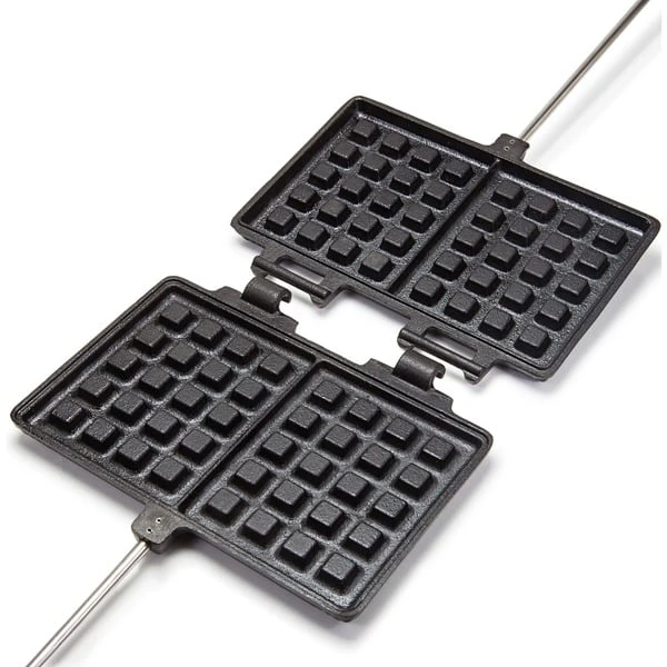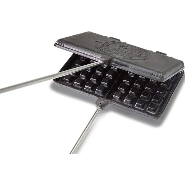 Das Waffeleisen wf-iron von Petromax bereichert die Outdoor-Küche um eine weitere Dessertvariation. Die gusseisernen Formen backen zwei Waffeln der Größe 9 x 11cm gleichzeitig und sind dank der vorbehandelten Oberfläche (seasoned finish) sofort einsatzbereit. Waffelteig einfüllen, das Waffeleisen gegebenenfalls einmal in der Hitze drehen und schon ist das leckere Gebäck fertig. Der praktische Verschlusshaken hält die Waffelformen zusammen, damit der Teig nicht herausläuft. Dank der Scharniere lassen sich die Gusshälften zum Reinigen leicht auseinander nehmen. Ob auf dem Grill oder am Lagerfeuer, in jedem Fall sorgt der lange Stab mit den Holzgriffen für ausreichend Abstand zur Wärmequelle und für eine sichere Anwendung.Art.-Nr.: 1533737