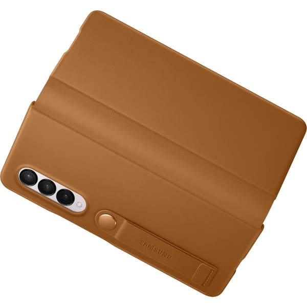 Das Leather Flip Cover verleiht dem Smartphone einen beeindruckenden Look und besitzt an der Rückseite ein Band, mit dem man das Smartphone festhalten kann. Wenn man freihändig Inhalte auf dem Galaxy Z Fold3 5G genießen möchte, kann man es ganz einfach auffalten und mithilfe des Standfußes sicher aufstellen.