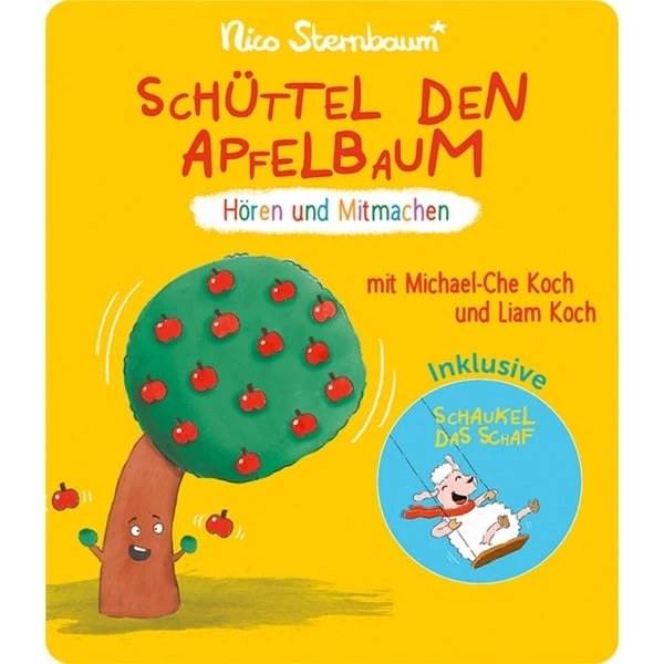 Dieses Hörspiel hat es in sich: Die kleinen Zuhörerinnen sollen mitmachen – also darf hier gestampft, geklatscht und gepustet werden! Denn der Apfelbaum, das Schaf Sarah und ihre Freunde brauchen Hilfe: Immer wenn der Erzähler das Kommando „Auf die Plätze, fertig, los!“ gibt, sind die Kinder dran! Wer stampft ganz fest mit, damit die schweren Äpfel vom Baum kullern? Wer zeigt Sarah, wie die Beinbewegung beim Schaukeln geht? Wer pustet die kleine Katze trocken? Wer kann bellen wie ein Hund? Und wer tanzt mit Lea um die Wette? Die Kinderbuchbeststeller „Schüttel den Apfelbaum“ und „Schaukel das Schaf“ von Nico Sternbaum wurden mit diesem Tonie als Hörspiel umgesetzt. Mit dabei ist auch ein Mitmach-Lied zum Mitsingen. Art.-Nr.: 100060588
