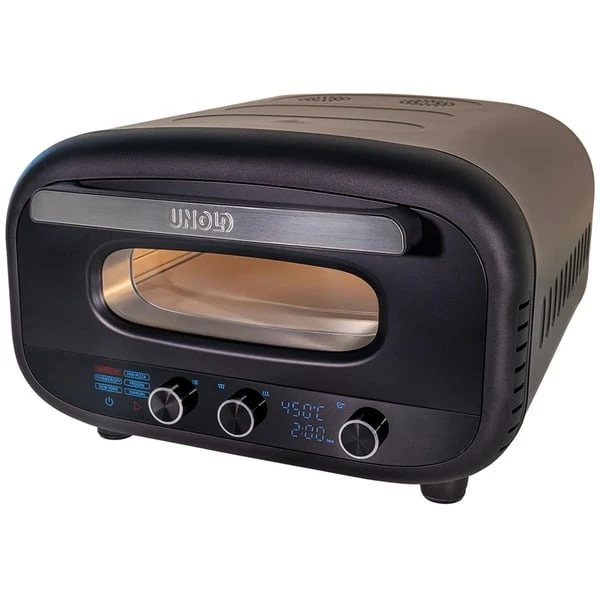 Der elektrische Pizzaofen Don Alfredo von Unold backt eine Pizza auf dem mitgelieferten Pizzastein mit bis zu 450°C in nur ca. 2 Minuten. Durch die doppelverglaste Tür und das hitzeisolierte, schwarz lackierte Stahlblechgehäuse geht er dabei mit dem Strom sehr sparsam um. Er verbraucht durchschnittlich nur 1 kW Strom bei höchster Heizleistung. Durch die zahlreichen fertigen Programme wie z.B. Napoli, New York-Style oder Tiefkühlpizza und die getrennt einstellbare Ober- und Unterhitze gelingt die perfekte Pizza mit knusprigem Boden und saftigem Belag ganz sicher. Man kann auch ein DIY Programm nach eigenen Wünschen erstellen. Der handliche, digitale Drehregler und das Touch-Control-Display ermöglichen eine einfache, getrennte Steuerung von Ober- und Unterhitze. Dank der gleichmäßigen Hitzeverteilung muss die Pizza während des Backvorgangs nicht gedreht werden. Das digitale Display zeigt die Temperatur und die Restlaufzeit an. Auch die Zubereitung von Flammkuchen, Fladenbrot und ähnlichem ist möglich.Art.-Nr.: 100121563