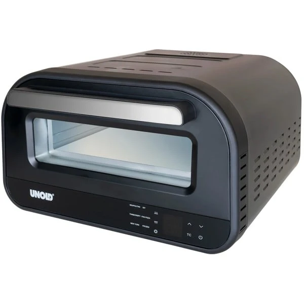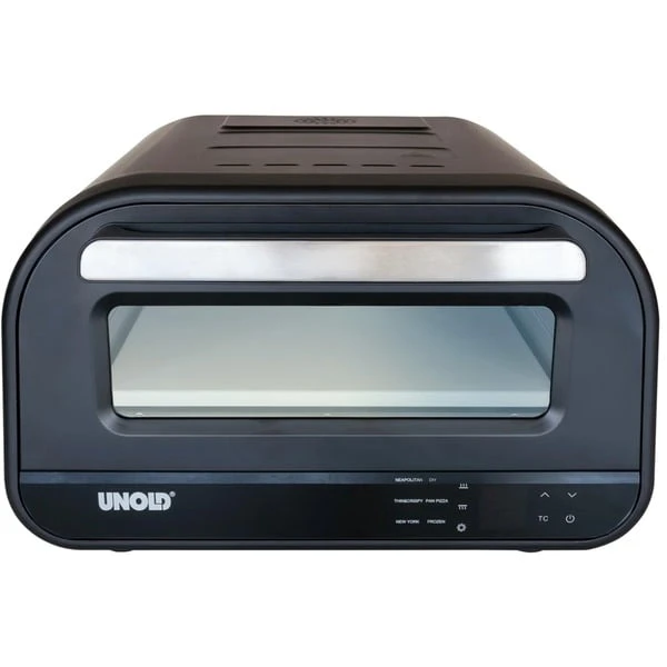 Der elektrische Pizzaofen Don Luigi von Unold in der Sonderedition in edlem Black-Steel inklusive Pizzaschieber, Pizzastein, Pizzabackform und Profi-Pizzaschneider, backt eine Pizza mit bis zu 400°C in nur ca. 2 Minuten. Durch die doppelverglaste Tür und das hitzeisolierte Edelstahlgehäuse geht er dabei mit dem Strom sehr sparsam um. Er verbraucht durchschnittlich nur 1 kW Strom bei höchster Heizleistung. Durch die zahlreichen fertigen Programme wie z.B. Napoli, New York-Style oder Tiefkühlpizza und die getrennt einstellbare Ober- und Unterhitze gelingt die perfekte Pizza mit Sicherheit. Man kann auch ein DIY Programm nach eigenen Wünschen erstellen. Dank der gleichmäßigen Hitzeverteilung muss die Pizza während des Backvorgangs nicht gedreht werden. Das digitale Touch-Control-Display zeigt die Temperatur und die Restlaufzeit an. Auch die Zubereitung von Flammkuchen, Fladenbrot und ähnlichem ist möglich.Art.-Nr.: 100050647
