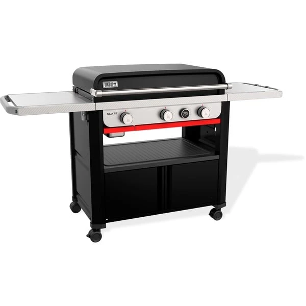 Die innovative Weber SLATE GPD 76cm Premium Plancha sorgt für noch mehr Grillspaß. Die große Grillfläche mit drei Brennern bietet mehrere Hitzezonen, starke Hitze, um Speck knusprig zu grillen, mittlere Hitze zum Braten von Eiern und schwache Hitze zum Rösten von Brot. Die glatte Grillfläche aus Gusseisen sorgt für eine gleichmäßig verteilte Hitze, sodass das Grillgut überall auf der Plancha einheitlich gegart wird. Die Plancha erreicht schnell Tempersturen über 260°C, zum scharfen Anbraten bei hoher Hitze. Das digitale Thermometer zeigt die aktuelle Temperatur der Grillfläche an. Die porzellanemaillierte Antihaft-Grillfläche ist sofort einsatzbereit, so dass saftige Burger, aromatische Pfannengerichte, lecker angebratene Meeresfrüchte, Gemüse und vieles mehr zubereitet werden kann. Die extra große Tropfschale zum Auffangen von Fett erleichtert die Reinigung nach dem Grillen. Die Besteckablage wird durch eine spülmaschinenfeste Matte während des Grillens vor Verschmutzungen geschützt. Die linke Seitenablage ist klappbar. Und mit dem Weber Works Zubereitungs-, Grill- und Aufbewahrungssystem können die Grill- und Reinigungsutensilien griffbereit aufbewahrt, Speisen und Gewürze von der Küche zur Plancha transportiert, der Seitentisch in eine Zubereitungsstation verwandelt und das Equipment in dicht verschlossenen Behältern verstaut werden (Zubehör separat erhältlich).Art.-Nr.: 100038290