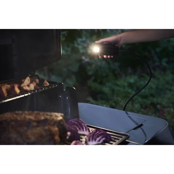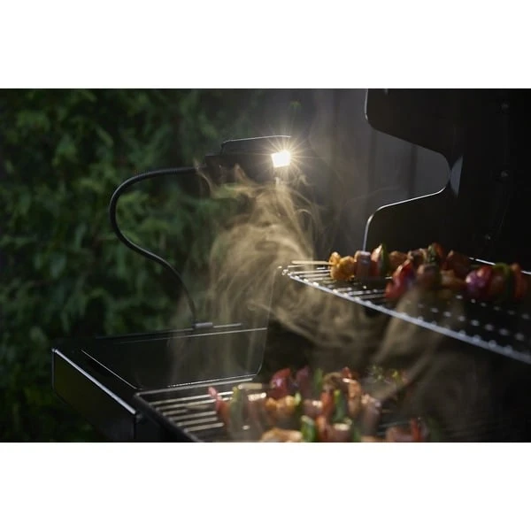 Grillen bis in die Nacht – mit dieser flexiblen leuchte aus der Serie Weber Works. Diese praktische LED-Lampe lässt sich an den seitlichen Weber Works-Schienen ausgewählter Weber Grills, Planchas und Holzpellet-Smoker befestigen und beleuchtet die gesamte Grill- und Vorbereitungsfläche. Der flexible Hals lässt sich so einstellen, dass der Lichtstrahl genau dorthin fällt, wo er benötigt wird. Außerdem kann die Leuchte vom Hals abgenommen und als Taschenlampe verwendet werden – ideal, um den Weg durch den Garten zu beleuchten. Diese LED-Leuchte wird mit 3 AAA-Batterien betrieben, die im Lieferumfang enthalten sind.