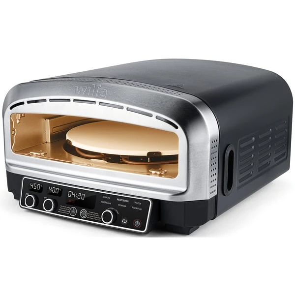 Der elektrische Pizzaofen CRUST von Wilfa bietet 2.200 Watt Leistung, eine präzise Steuerung und ein authentisches Steinofen-Erlebnis. Mit einer Temperatur von bis zu 450°C, einer separaten Regelung für Ober- und Unterhitze sowie einem drehbaren Pizzastein backt er die perfekte Pizza in Restaurantqualität in ca. 90 Sekunden. Mit seinem intuitiven Bedienfeld und sechs voreingestellten Programmen für Manuell, Neapolitanisch, Tiefkühlpizza, New York Style, Romana dünn und knusprig oder Focaccia ist dies der ideale elektrische Pizzaofen für alle, die Leistung und Präzision ohne Komplikationen wünschen.Art.-Nr.: 100154171
